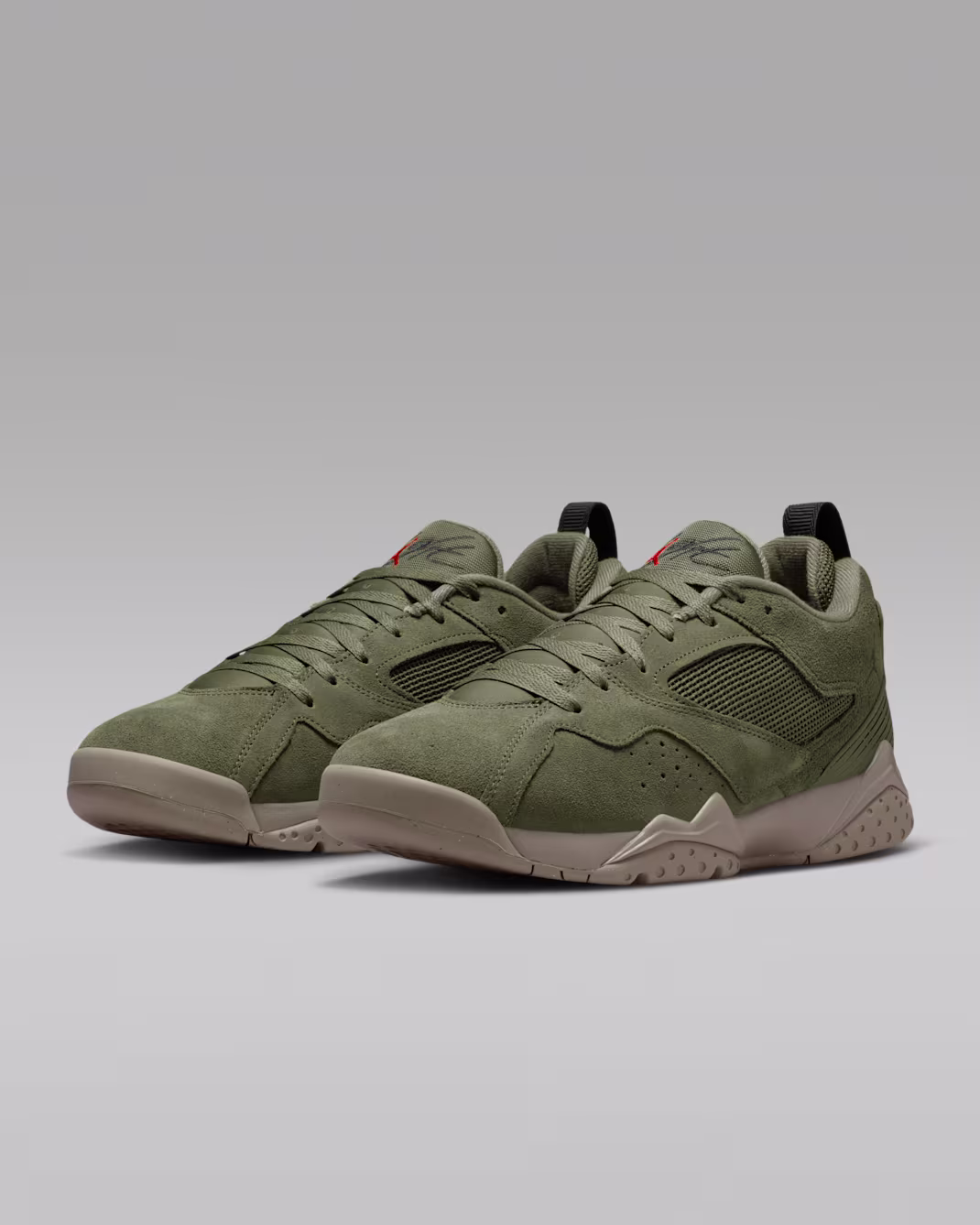 • Különleges színvilág: Az „olívazöld” (Medium Olive) nubuk felsőrész rendkívül strapabíró és prémium érzetet kelt, amit a piros (University Red) Jumpman logó tesz teljessé.